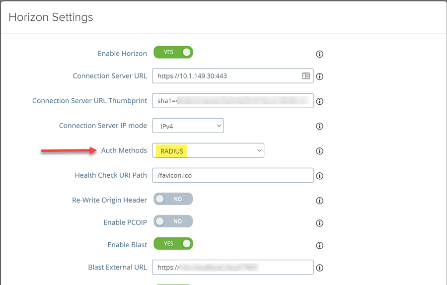 After configuring the RADIUS settings, you then just need to set your Edge Services configuration for Horizon to use RADIUS in the Auth Methods.
