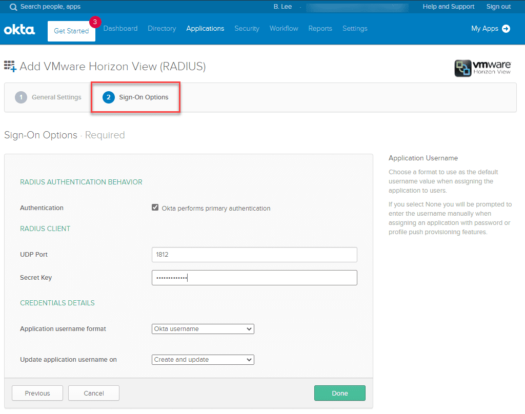 Under the Sign-On Options tab for the application, make sure to enter the same shared secret key as you did when configuring the RADIUS agent on-premises.
