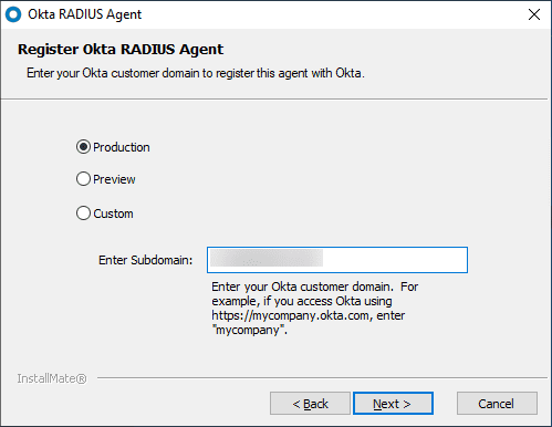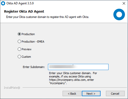 Select the environment you want to use for the OKTA AD Agent. Then, enter your subdomain. For most, this will be production.