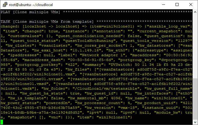 vcenter_hostname: vcsa.cloud.local username: [email protected] password: P@$$w0rd1$ notes: Automated VM creation test folder: testansible datastore: vsanDatastore datacenter: CloudLocal vmtemplate: Win2019clone customization_spec: CloudLocalServerDHCP vmcluster: vsancluster state: poweredon servers: - win19clone01 - win19clone02