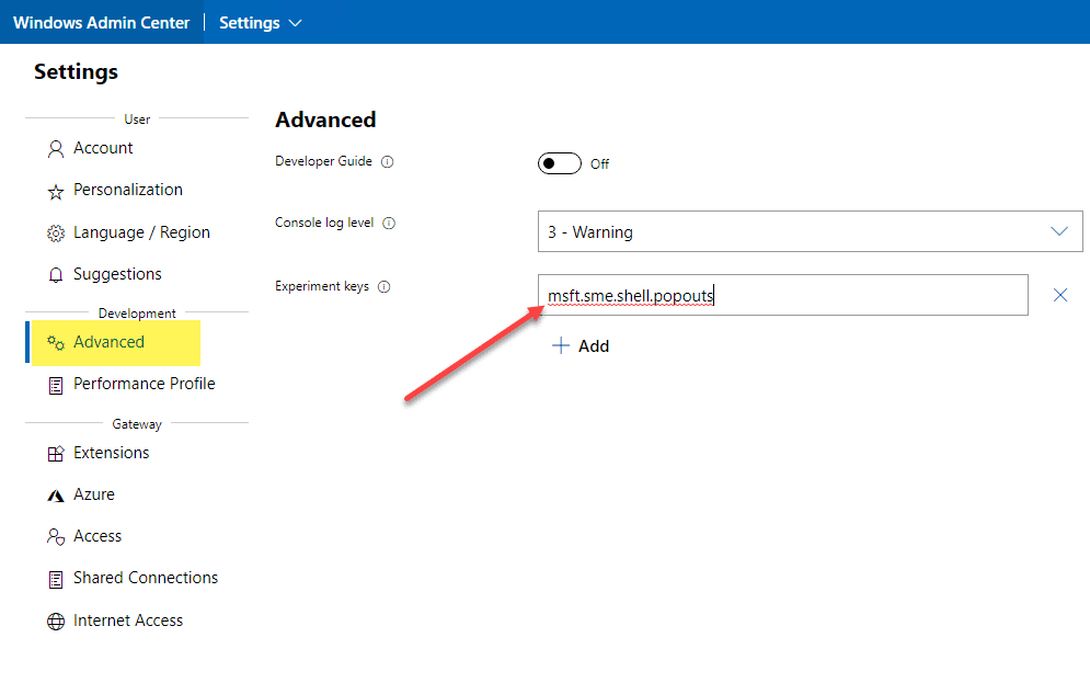 It probably got your attention with a secret feature noted! Microsoft has added the ability in Windows Admin Center Preview 2012 to allow popping out the WAC extension windows in the GUI. You have to first enable this feature under the developer options by adding a “key” there. Then, simply hover over the extension name and you will see the new pop out button.