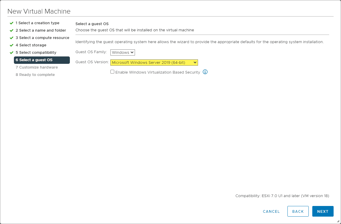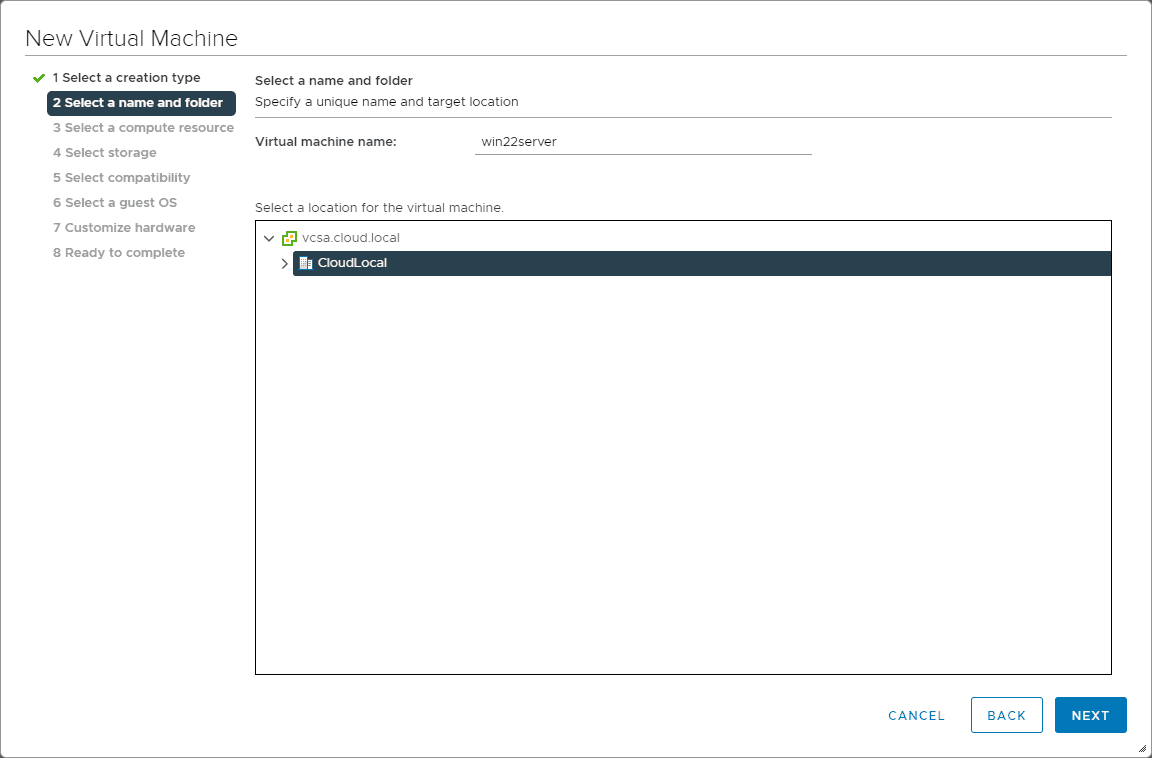 In VMware, here I am creating a new virtual machine to house the Windows Server 2022 installation.