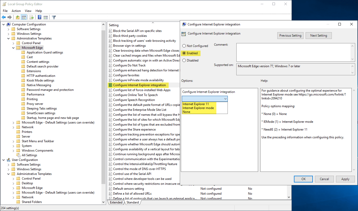 The Configure Internet Explorer integration is a way to use what is called IE Mode in Microsoft Edge. What is IE Mode? In the About IE Mode document found here, Microsoft describes it this way.