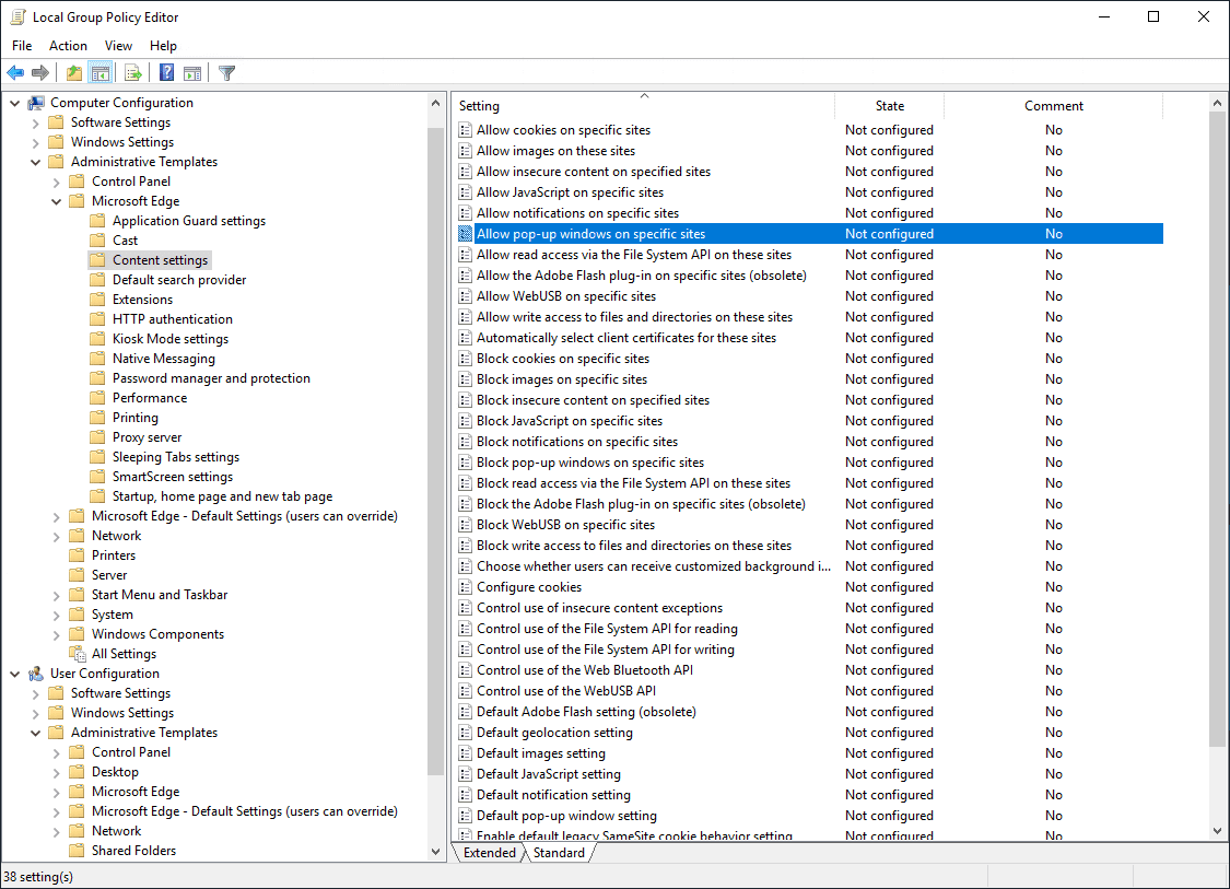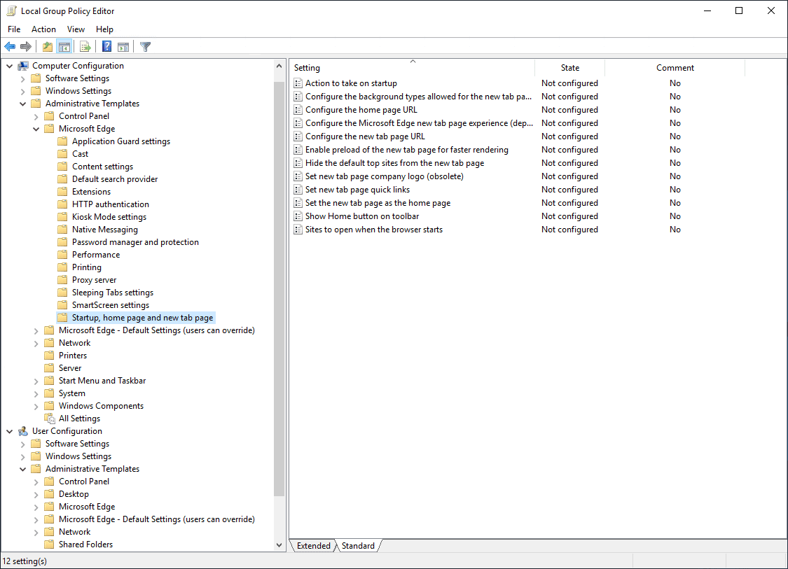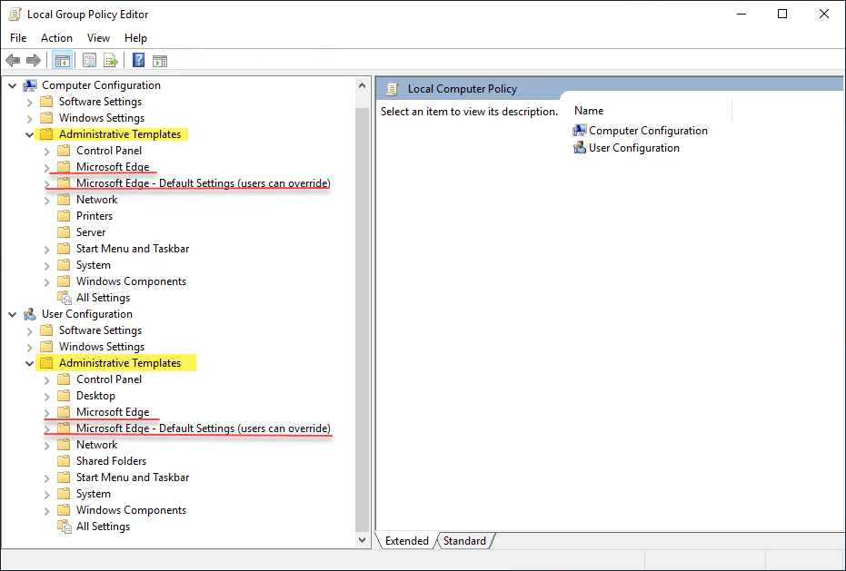 - To confirm the files loaded correctly, open the Group Policy Management Editor from Windows Administrative Tools and expand Computer Configuration > Policies > Administrative Templates > Microsoft Edge. You will see the new Microsoft Edge node entries appear.