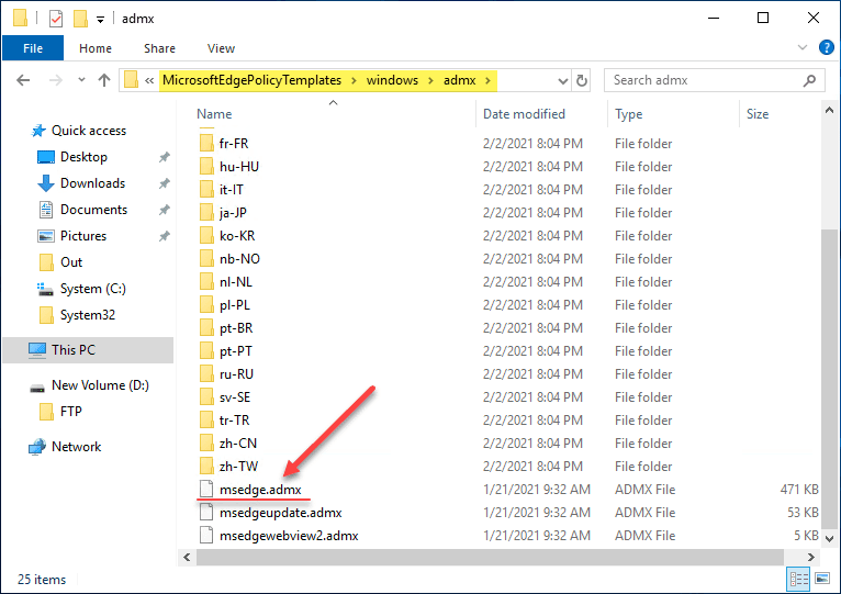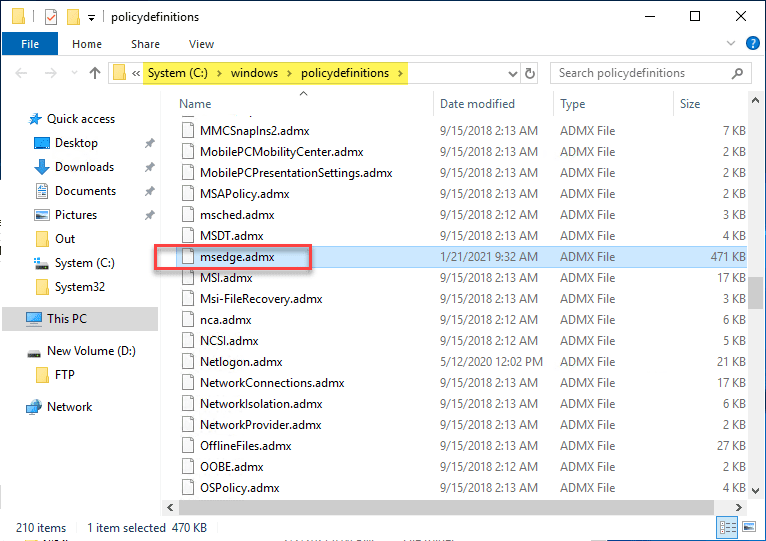 - Copy the msedge.admx file to the PolicyDefinition folder.