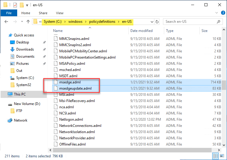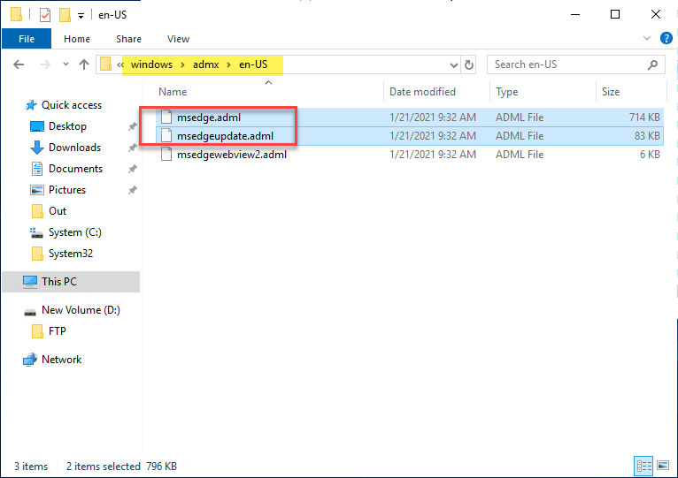 Paste the msedge.adml and msedgeupdate.adml files into the c:\windows\policydefinitions\en-US folder.