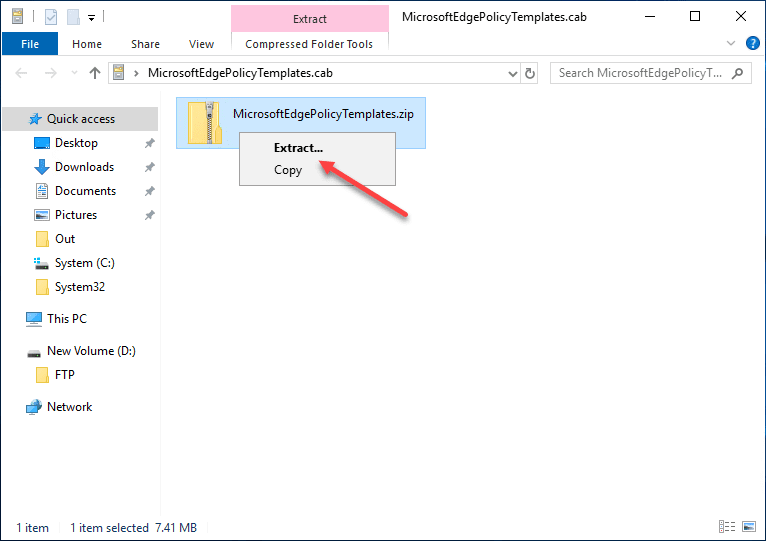 In this walkthrough, I will be extracting the Group Policy template files locally and controlling them locally as opposed to Domain-wide group policy. There are a couple of extraction steps to carry out once the .cab file is downloaded. Extract the .zip file from the cab file.