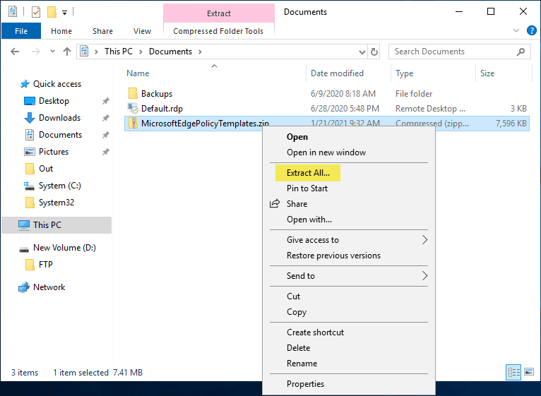 Once you have the .zip file extracted, copy the msedge.admx file from the MicrosoftEdgePolicyTemplates > windows > admx folder.