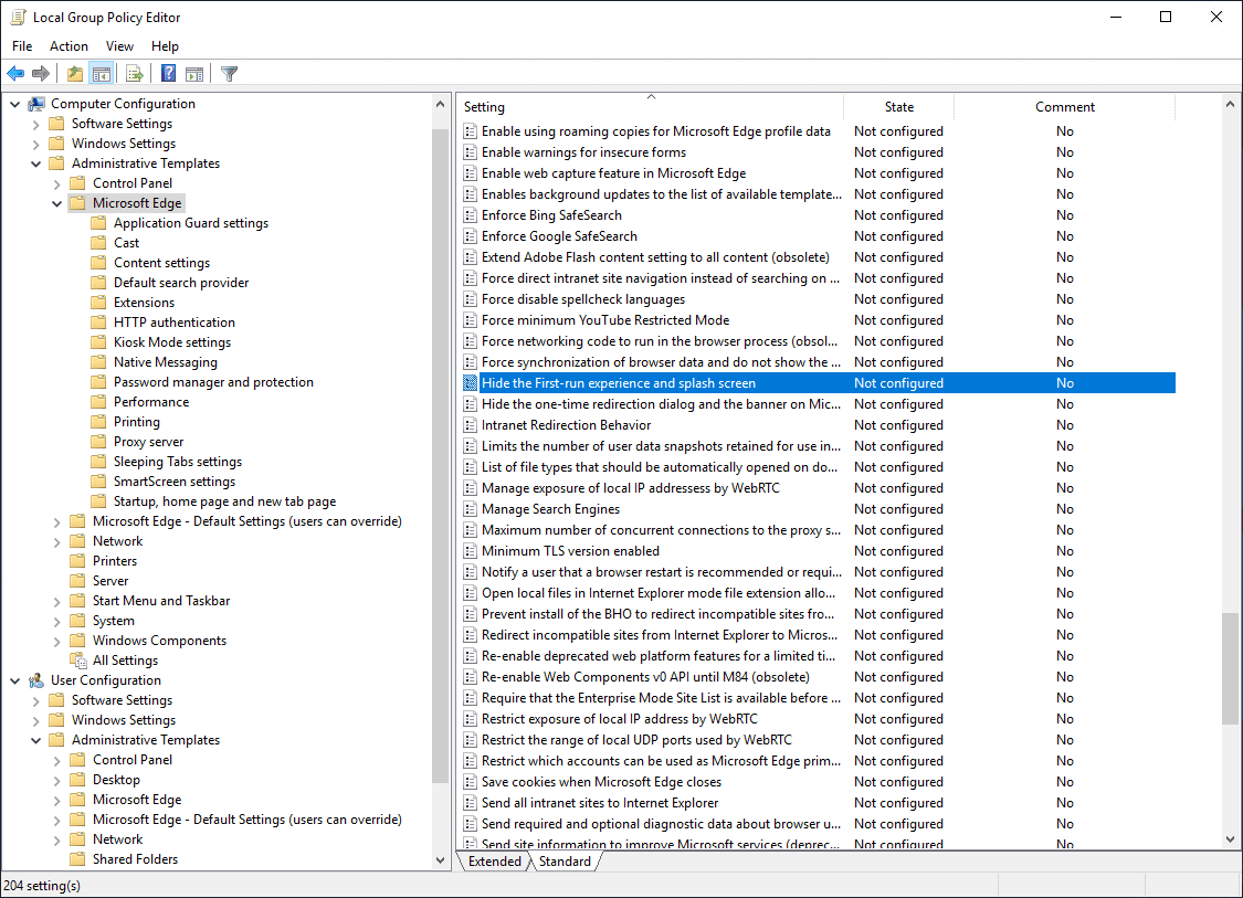 Most of the settings to note are in the root Microsoft Edge folder in Group Policy. The first setting is the Hide the first run experience and splash screen.