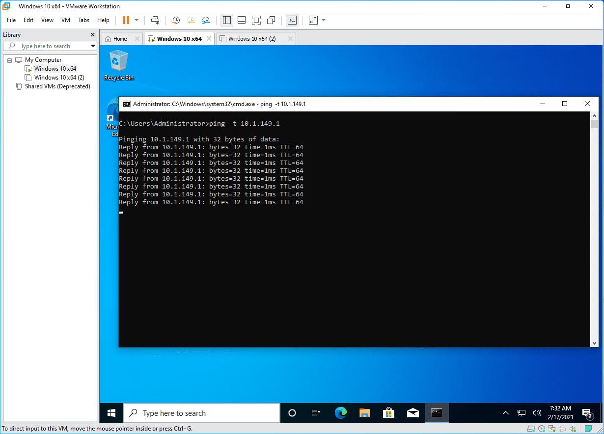 I am using VMware Workstation Pro 16 for the demonstration. Take a look first at the scenario here. I have a Windows 10 Pro workstation running in VMware Workstation. I have started a continuous ping on my lab gateway which is working as expected. I see sub 1 ms latency, no packet loss, etc.
