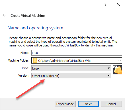 Since we have nested virtualization in VirtualBox fresh on the mind, let’s look at nesting VMware ESXi inside a VirtualBox VM. The first thing we need to do is create a new VirtualBox virtual machine for the ESXi host. Use the version of Other Linux (64-bit) for your ESXi host.