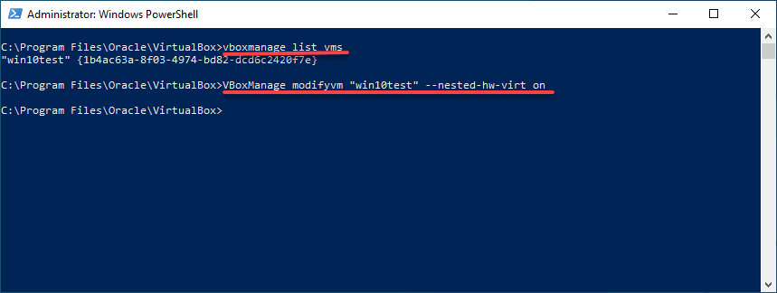 vboxmanage modifyvm "<your vm name>" --nested-hw-virt on