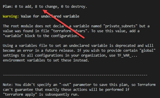 - terraform plan – Plan basically shows you what you are going to do when running the code. It will show the “intent” if you will for your apply operation. It also checks syntax and other things. It will show the resources that are to be added, destroyed, or changed.