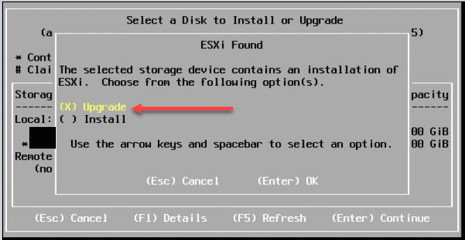 - Boot your failed ESXi 7.0 Update 2 host from the ISO image for ESXi 7.0 Update 2 and perform an upgrade using the media.