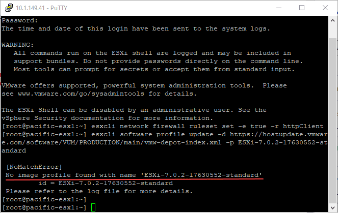 VMware has proactively pulled the current image profile for ESXi 7.0 Update 2. The image profile that was posted previously, ESXi-7.0.2-17630552-standard, is no longer found if you try to perform an update using esxcli or other tools that hit the update repository.