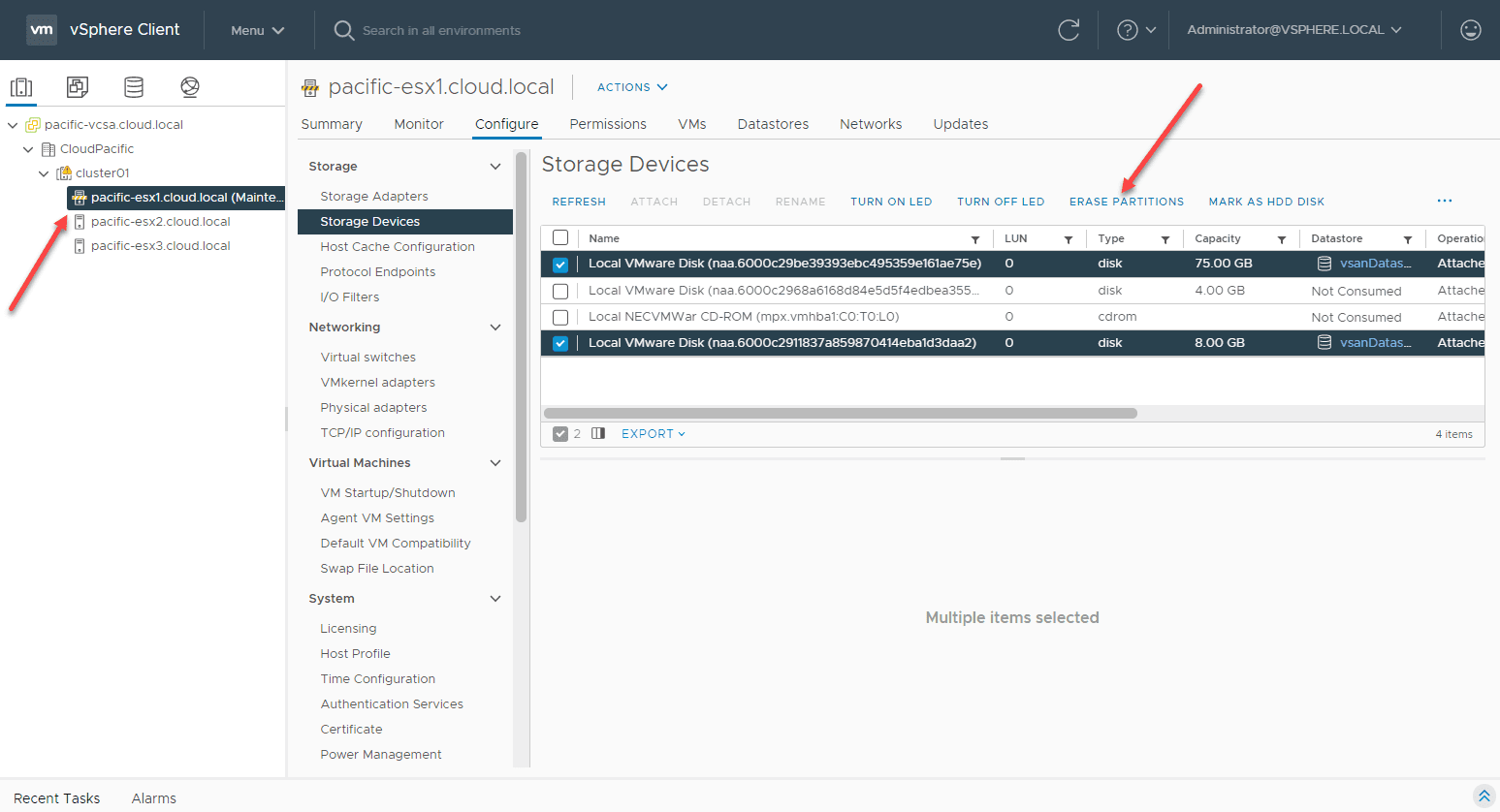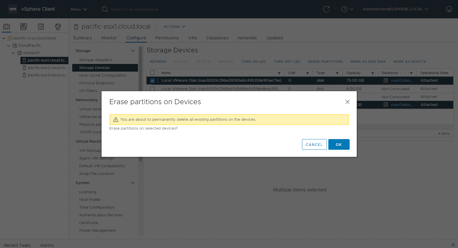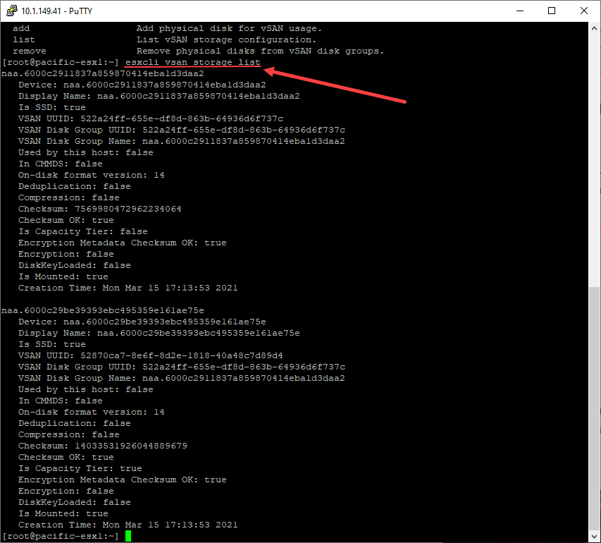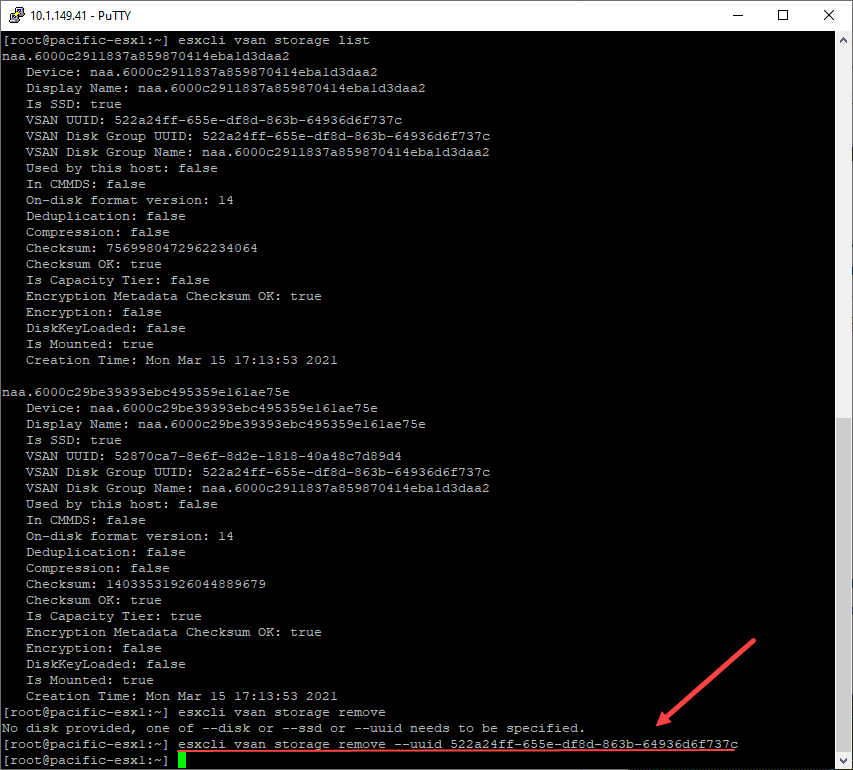 However, after trying to delete the partitions after simply leaving the vSAN cluster through the esxcli command, erasing the partitions still fails. Let’s remove the storage from the vSAN host. To see which storage is a part of the vSAN allocated storage on the host, you can use: