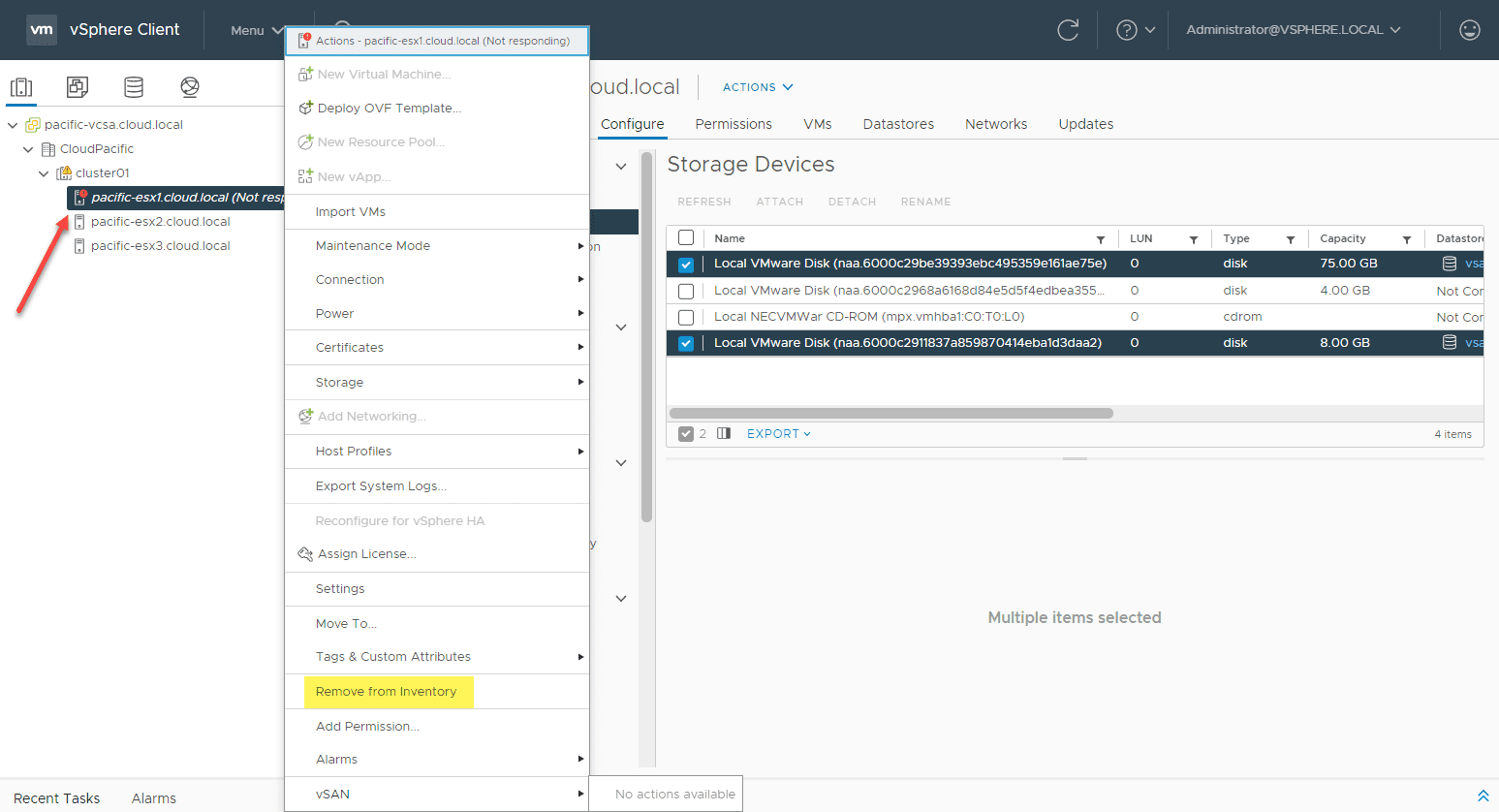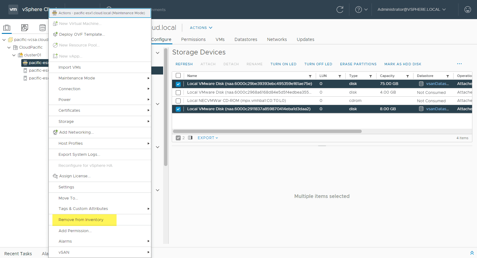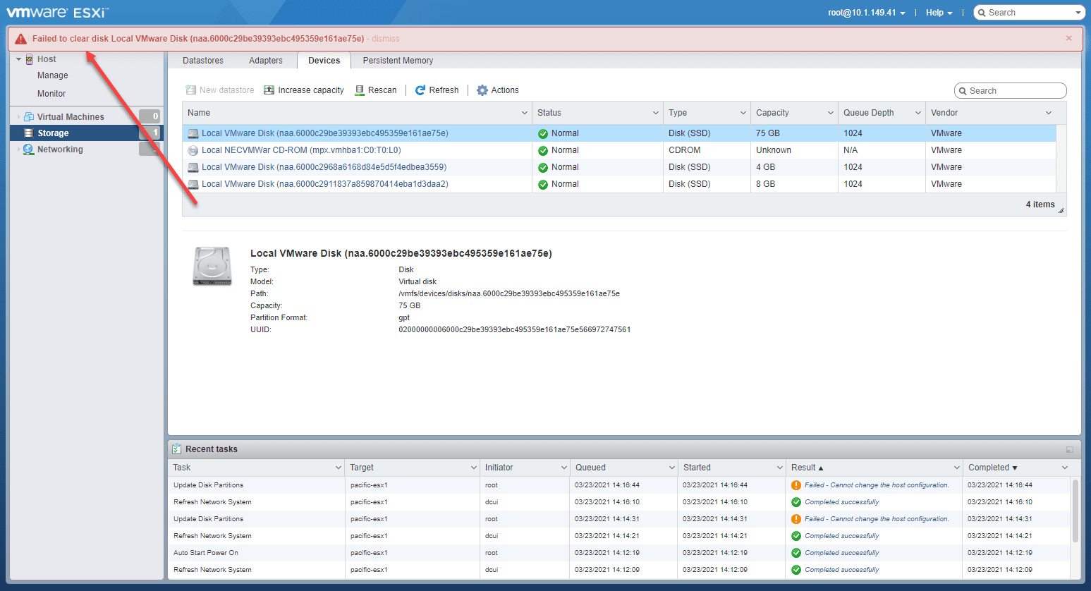 However, after trying to delete the partitions after simply leaving the vSAN cluster through the esxcli command, erasing the partitions still fails. Let’s remove the storage from the vSAN host. To see which storage is a part of the vSAN allocated storage on the host, you can use: