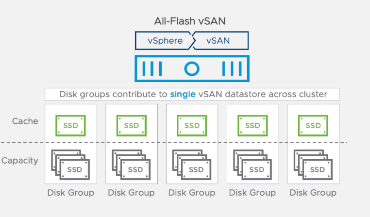 - Every ESXi host in a vSAN-enabled vSphere cluster will contain at least 1 disk group