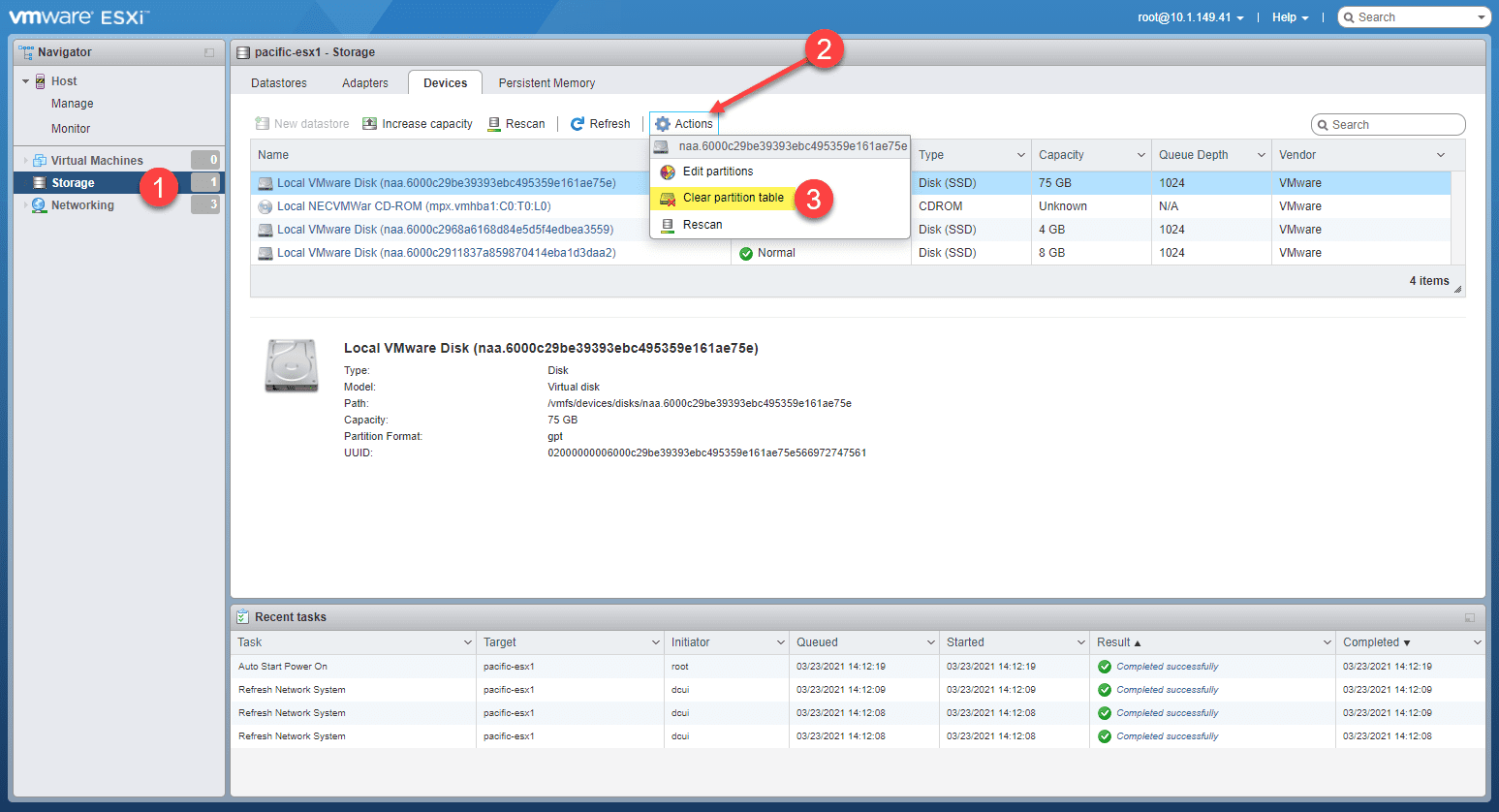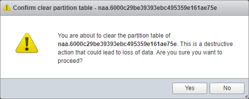 Now that we have the host removed from the vSAN cluster from vCenter, let’s see if we can simply erase the partitions on the vSAN disks. This is logged in directly to the ESXi host via the host UI. Click Storage > Actions > Clear partition table.