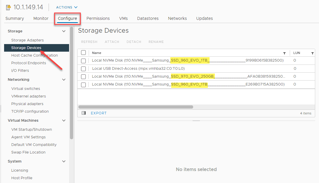 Below is a look at an ESXi host in a vSAN-enabled vSphere cluster and the Storage Devices installed.