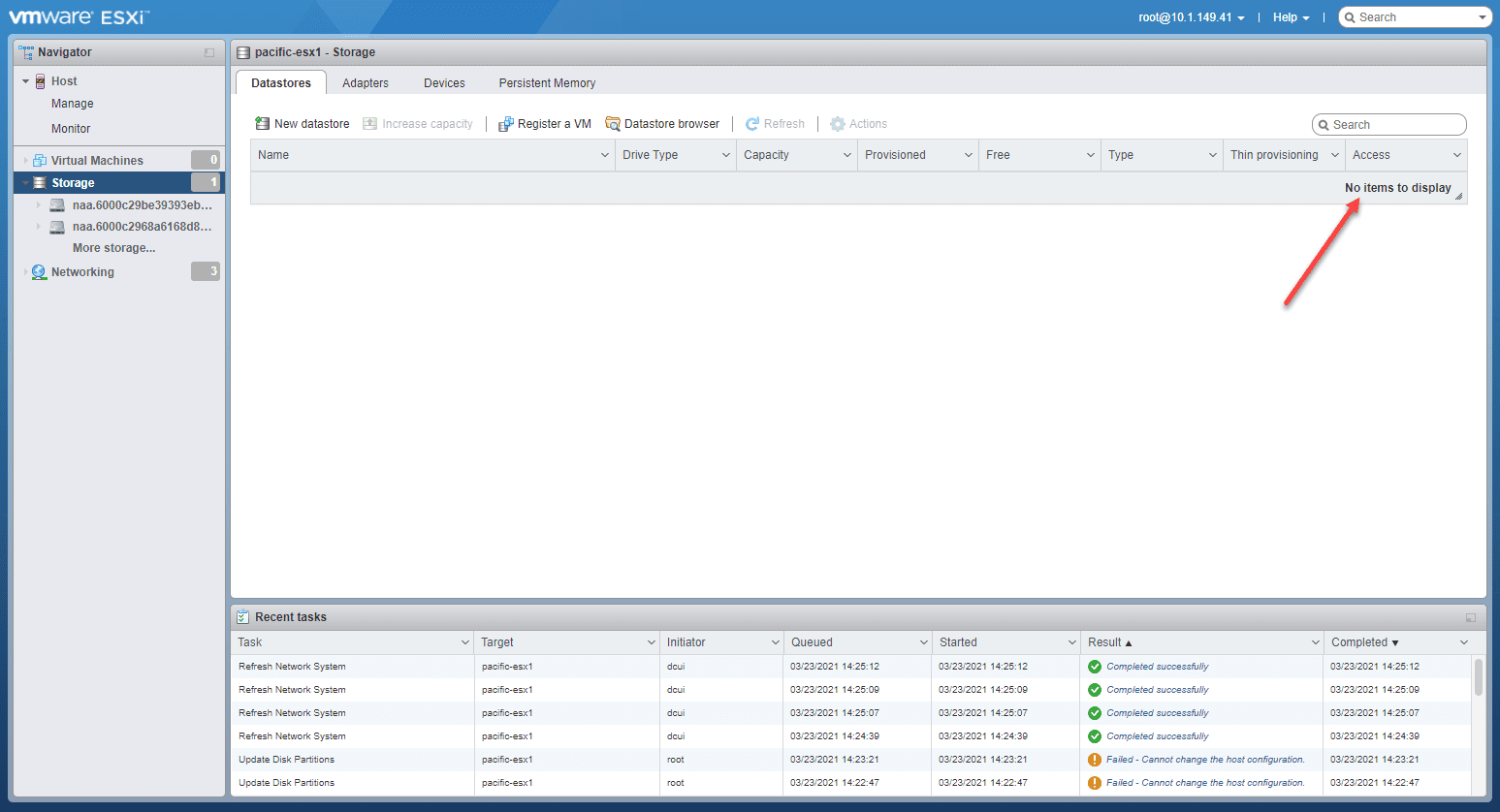 Now, when looking at the storage from the host UI, there are no datastores appearing. Before the vsandatastore was showing.