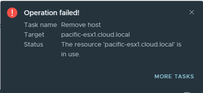 I didn’t grab screenshots of this, but trying to delete the disk group for the particular host shows the disk group/host is in use with a similar error to above. Let’s see if we can remove the host from the vSAN cluster if it is in maintenance mode.