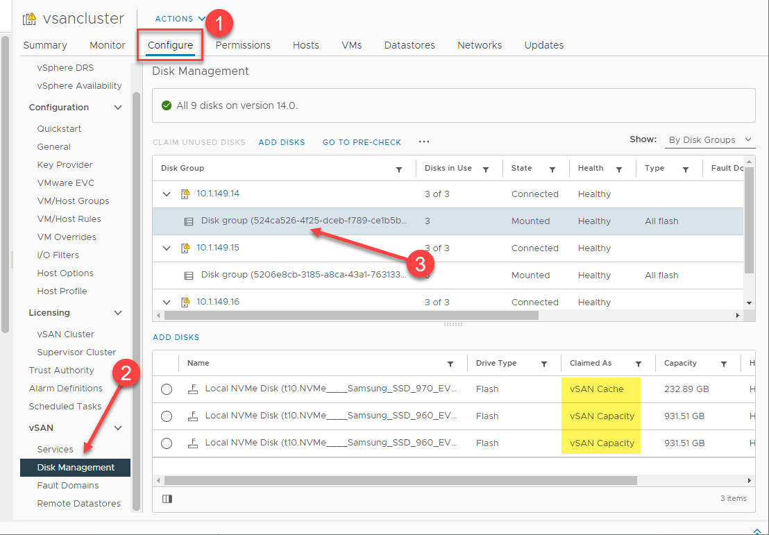 This shows the disks that are allocated to vSAN storage and the disk group they belong to.