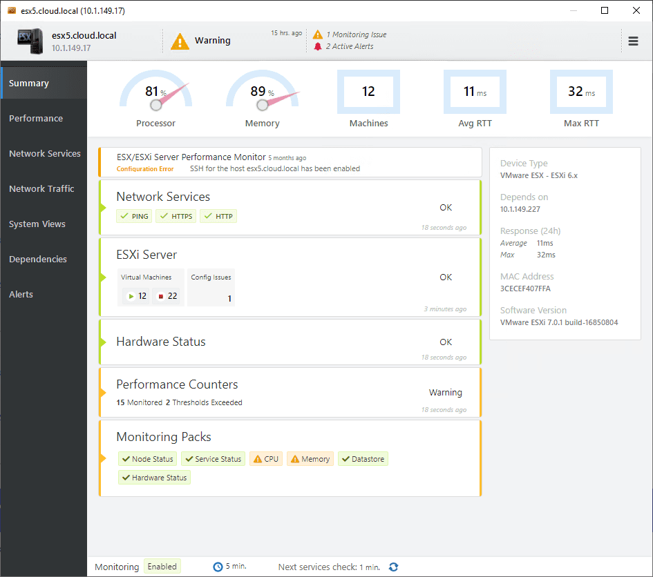 If you take a look at the status of an ESXi host, you get a great deal of detailed information regarding the host’s health. This includes the processor and memory utilization, virtual machines, RTT time, and max RTT. You can see if you have any monitoring alerts or other issues with the host as well.