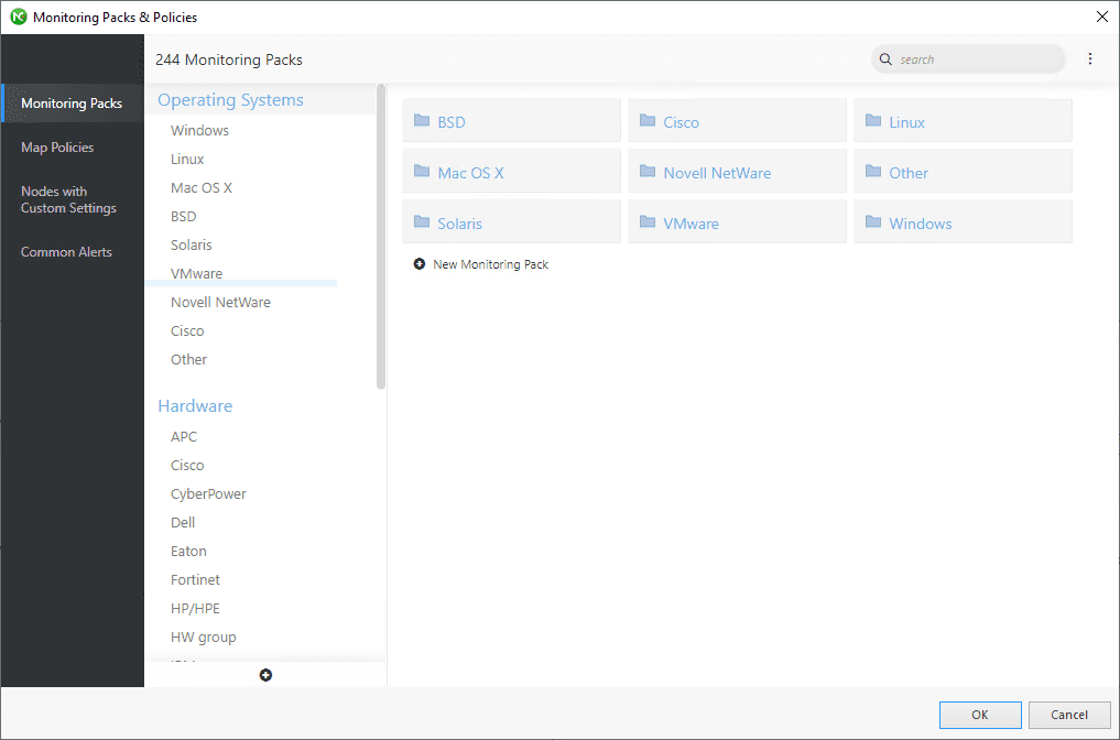 NetCrunch has a unique approach to how it monitors your environments. It uses what it calls “Monitoring Packs” which provide a predefined set of performance metrics, triggers, and events that it monitors. NetCrunch automatically assigns the appropriate monitoring packs to devices it discovers in the network scans, however, the monitoring packs can be assigned both automatically and manually.