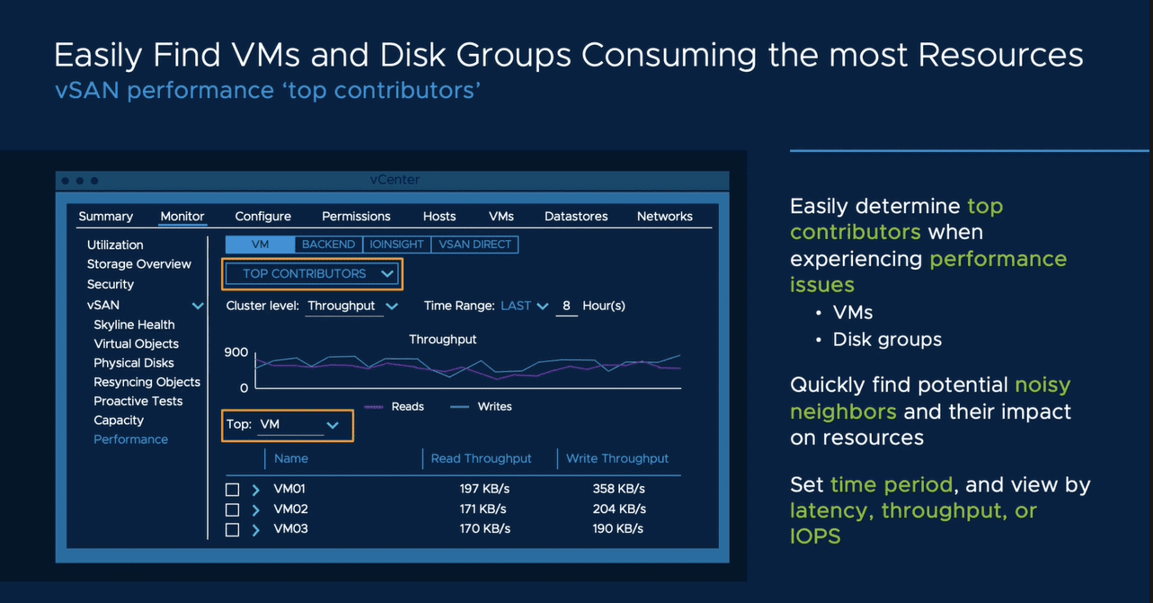 VMware vSAN 7.0 Update 2 provides clear indications of which VMs are contributing to performance issues. This includes which VMs, diskgroups, and other metrics in the enviroments. This will allow admins to easily identify problem workloads. It also provides a customizable time-based view to understand the performance issues over time.