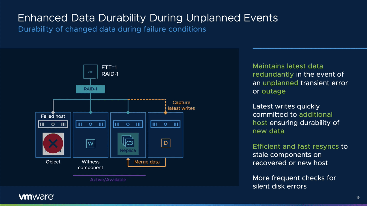 This helps to ensure the durability of the changed data in the event an additional outage occurs on the other host holding the active object replica. This builds on the capability that was introduced in vSAN 7.0 Update 1 that used the technique of planned maintenance events. These improvements have an additional benefit – improving the time the data is resynchronized to a stale object.