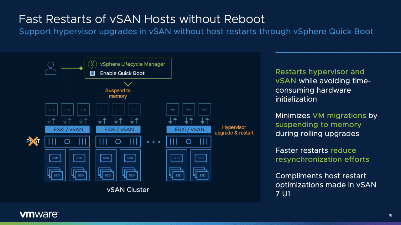 VMware vSAN 7.0 Update 2 provides better integration and coordination for vSAN hosts using the Quck boot to speed up the host update process. By suspending VMs to memory and better integration with the Quick boot workflow, the amount of data moved during a rolling upgrade is reduced due to reduced VM migrations and a smaller amount of resynchronization data. This helps to deliver a much more efficient host update process.