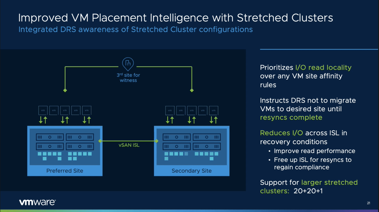 VMware vSAN 7.0 Update 2 now incorporates integration with intelligent data placement operations in vSAN stretched clusters with Distributed Resource Scheduler (DRS) functionality. After a recovered failure condition, DRS will keep the VMs state at the same site until data is fully resynchronized which ensures all read operations will not traverse the intersite link.
