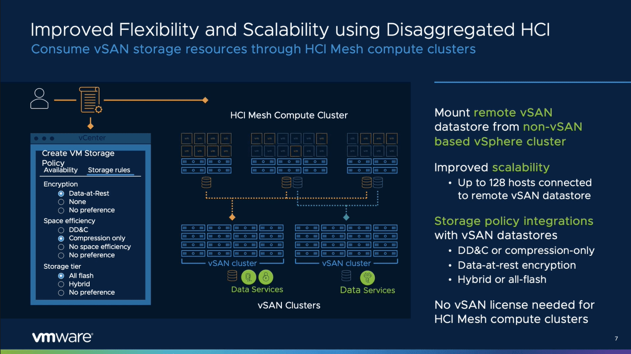 Multiple HCI Mesh compute clusters can connect to remote vSAN 7.0 Update 2 datastores in the same way traditional vSphere clusters can connect to traditional storage arrays. There are many advantages to this architecture. These include: