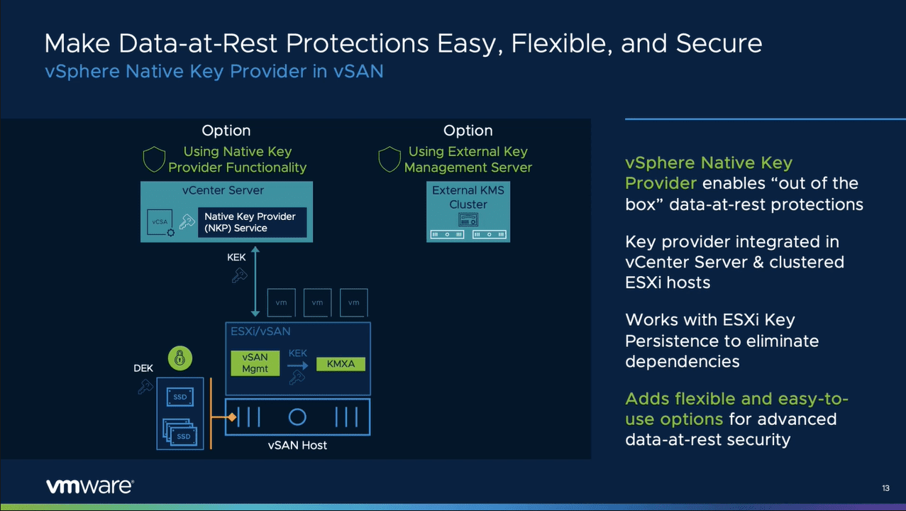 New with VMware vSAN 7.0 Update 2, VMware has introduced a native key provider feature. This can greatly simplify the process of encryption for environments who want to begin using this feature of vSphere. The embedded Key Management Server (KMS) is ideal for edge or two-node topologies and allows intrinisc security to be a part of the new vSAN 7.0 Update 2 release in an even more simplified and pronounced way.