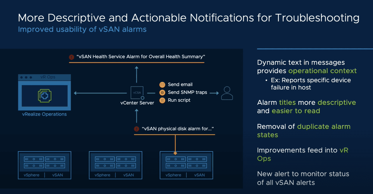 The more meaningful alarms are the more actionable they are. Several alerting improvements are found in this vSAN release. The alerting in this release is much more descriptive with descriptive titles and dynamic text for a specific device and host to provide improved operational context.