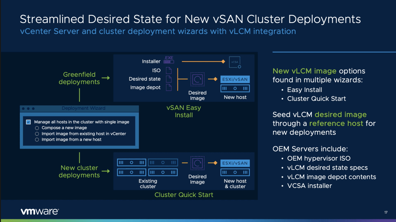 In addition, deploying a new vSAN cluster is even easier. Now with vSAN 7.0 Update 2, vSphere Lifecycle Manager (vLCM) has been integrated into the Easy Install and Quick Start deployment wizards for the deployment of new hosts and clustes from OEMs that support vLCM.