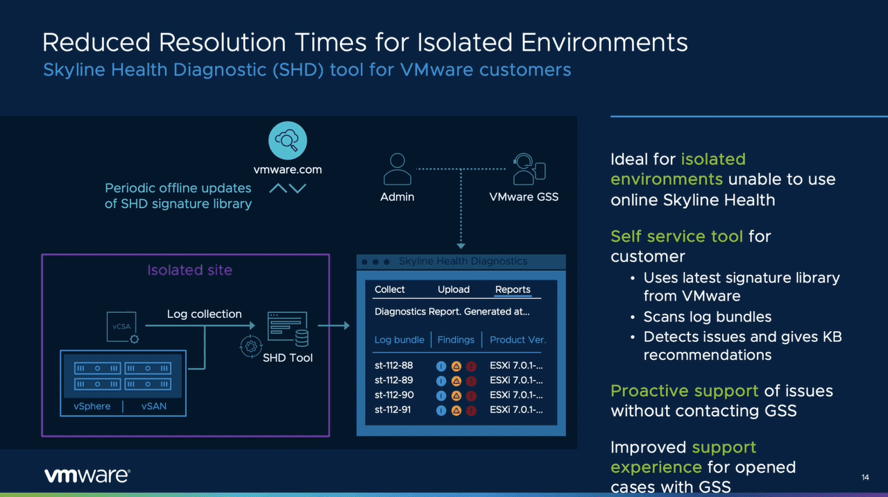 VMware has worked on much better solutions for improving cloud-connected, proactive support diagnostics and resolution with Skyline Health. The Skyline initiative is part of the vSphere and vSAN solutions.