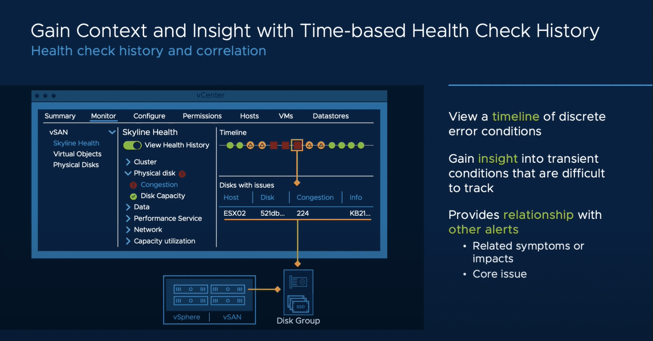 Automated alerts help admins to view conditions of the environment when events arise. Sometimes it is difficult to correlate these. VMware vSAN 7.0 Update 2 provides context and intelligence to help administrators understand the alerts received and how they apply and relate.