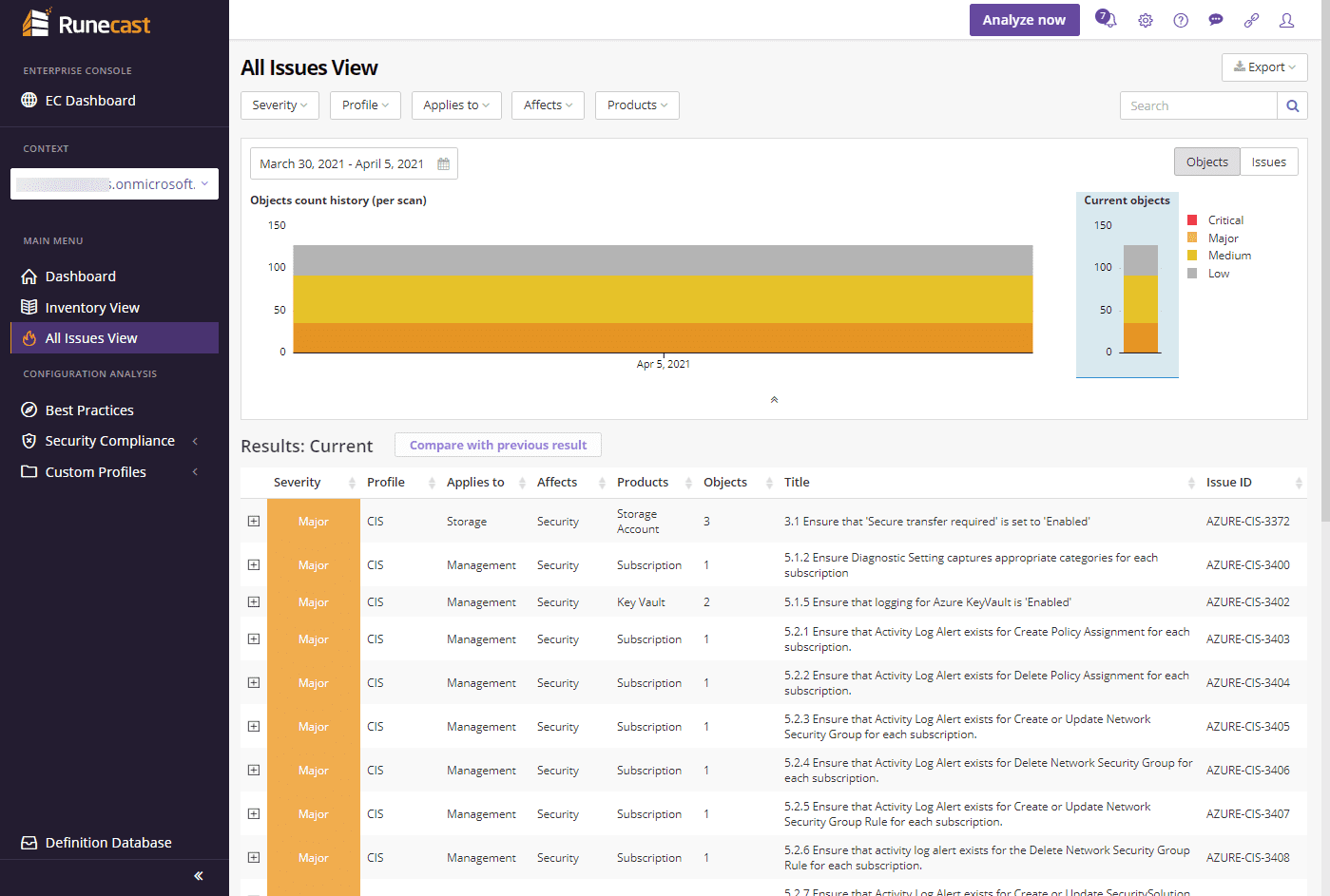 Runecast Analyzer 5.0 makes it easy to drill into the findings from any environment, including Microsoft Azure. Below, the Dashboard view gives a good overview of issues found in the environment and allows quickly and easily seeing hotspots for security or other configuration issues that may be present.