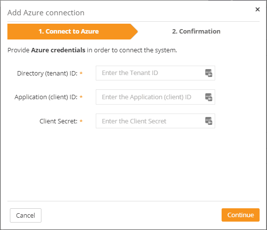 This will bring up the Add Azure connection dialog. It needs the expected information connecting to your Azure environment, including: