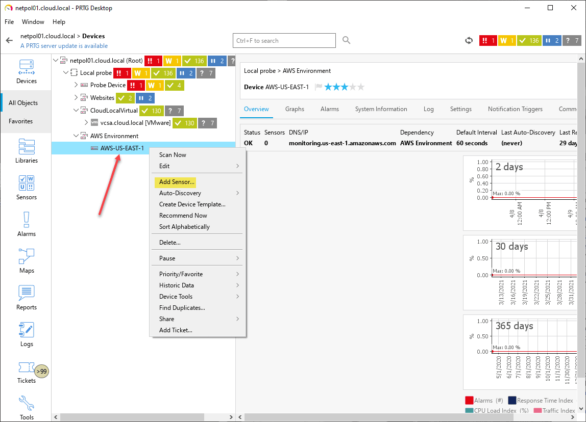 For the new AWS device that is pointing to the CloudWatch API URL for monitoring the AWS environment, just right-click and choose Add Sensor.