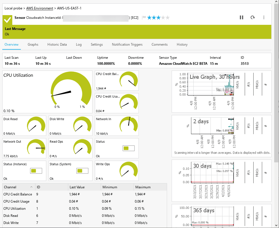 Once you have added the CloudWatch EC2 sensor as I have done here, you will see detailed statistics, including the CPU utilization, credit balance, network in, network out, disk read, disk write, and other helpful metrics.