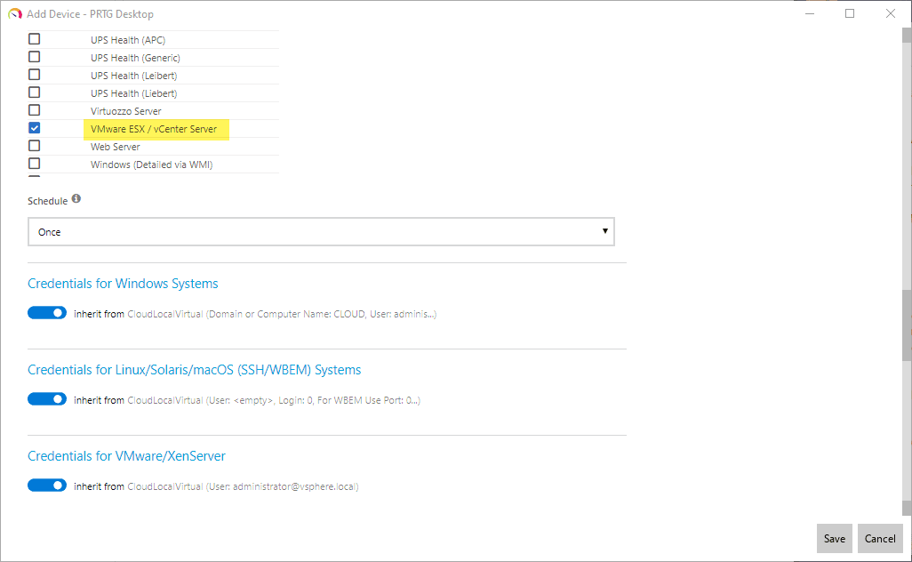 Below is a screenshot of adding the VMware ESX / vCenter Server to PRTG.