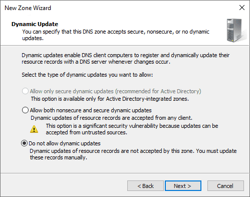 By default, when importing, the Dynamic Update option will be set to Do not allow dynamic updates. This means your clients will not be able to update DNS automatically. You can set it to allow both nonsecure and secure dynamic updates, however, this is a security risk. Note the allow only secure dynamic updates is greyed out. This option is Active Directory available only for integrated zones.
