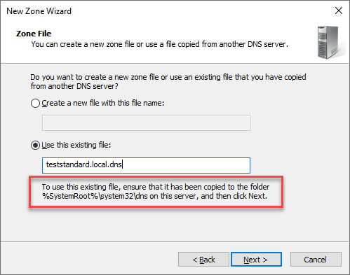 As a note, if you are running a DNS zone that is simply a standard zone, you can just copy the flat files from c:\windows\system32dns for the zone and place these on the new server you want to use as the DNS server. We will look at how to point to those files below using the DNS Management console.