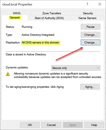 DNS can be replicated as part of the Active Directory partitions replicated between domain controllers. You see this when you create a new DNS zone, you can choose to make the zone an Active Directory integrated zone as mentioned earlier. Note what this looks like. On the General tab, you see the Replication section with the Change button you can click on.