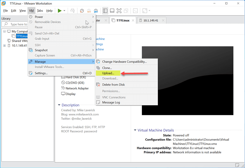 Now, for the actual upload process. To upload a virtual machine from VMware Wokstation, the virtual machine needs to be powered off. To kick off the upload process, click the VM > Manage > Upload option.