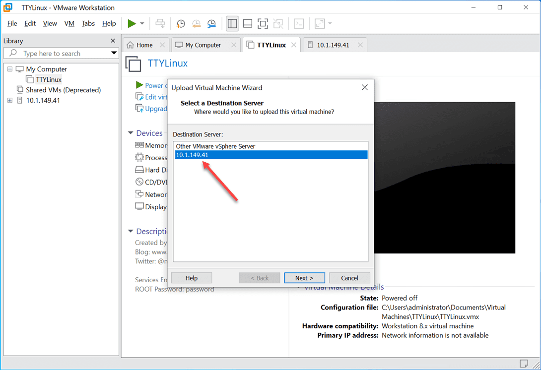 Now, the connection to the ESXi host established earlier, comes into play. Select the destination ESXi host for uploading the VM from VMware Workstation.