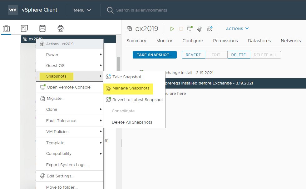 The other snapshot options you will use include the manage snapshots, revert and delete snapshots option. When you click to manage snapshots, you will be taken to a view of all snapshots on your virtual machine where you can choose which snapshot you want to revert to or delete. You can use the quick revert to latest snapshot to revert to the most recent snapshot running on a virtual machine. Also, you can use the delete all snapshots option to get rid of all snapshots that are found on a virtual machine.